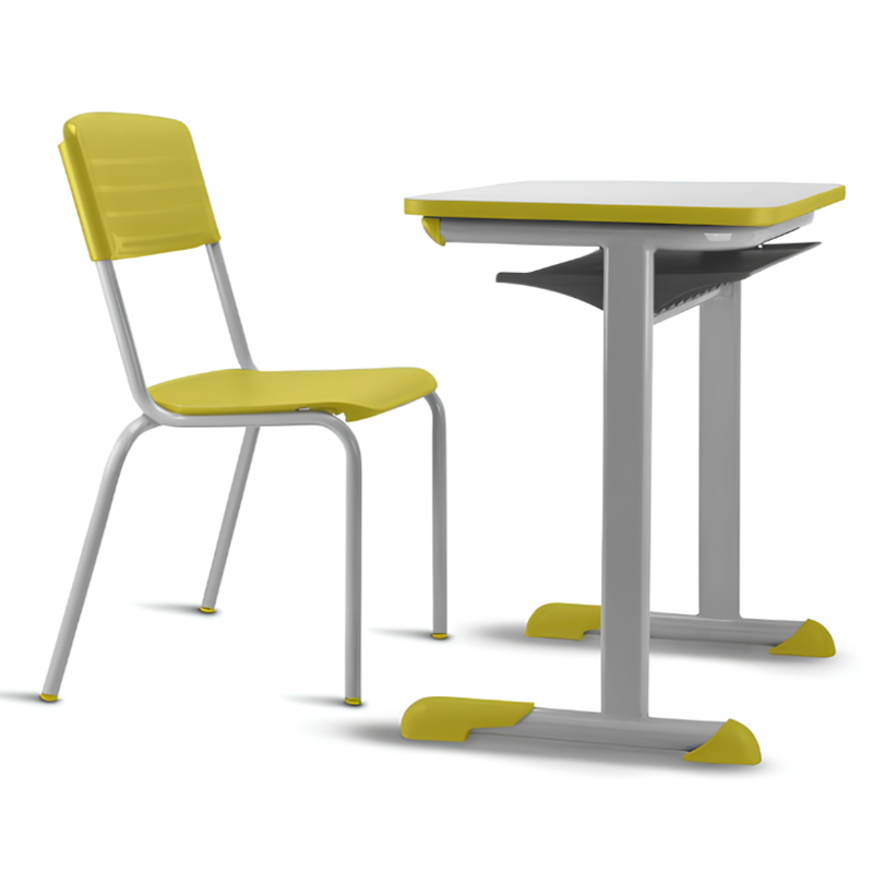 Conjunto para aluno tamanho 03 – Amarelo. Tampo em ABS ou Aglomerado. Altura do aluno: 1,19m a 1,42m.