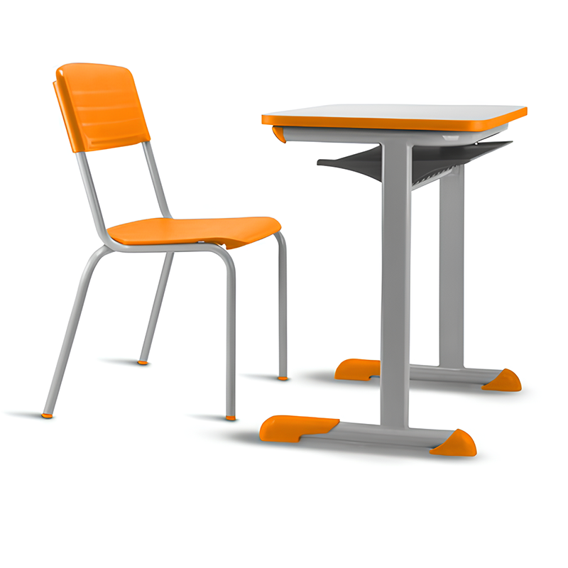 Conjunto para aluno tamanho 01 – Laranja. Tampo em ABS ou Aglomerado. Altura do aluno: de 0,93m a 1,16m.