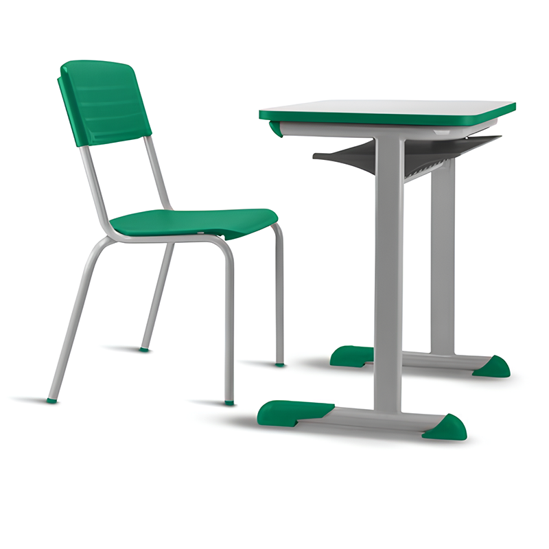 Conjunto para aluno tamanho 05 – Verde. Tampo em ABS ou Aglomerado. Altura do aluno: de 1,46m a 1,76m.