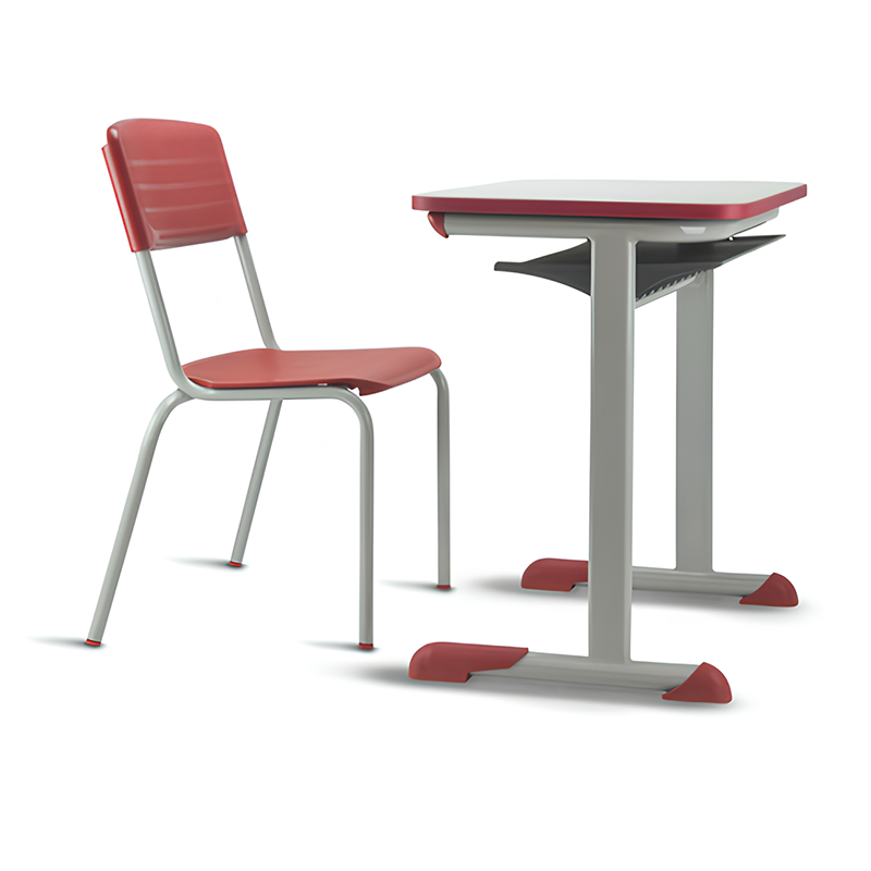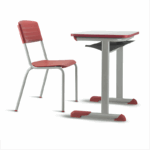 Conjunto para aluno tamanho 04 – Vermelho. Tampo em ABS ou Aglomerado. Altura do aluno: de 1,33m a 1,59m.